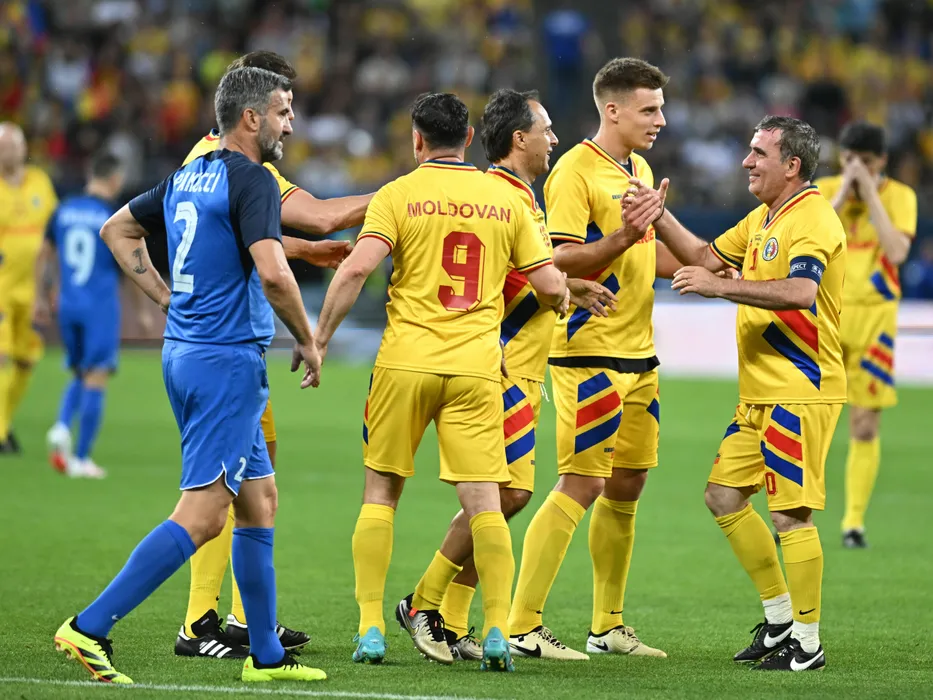 Bucurie a fotbalistilor romani Basarab Panduru, Razvan Prodan si Gheorghe Hagi dupa un gol marcat in meciul amical de fotbal dintre Romania Generatia de Aur si Legendele Lumii, desfasurat pe Arena Nationala din Bucuresti, sambata 25 mai 2024. © FOTO:Razvan Pasarica/SPORT PICTURES