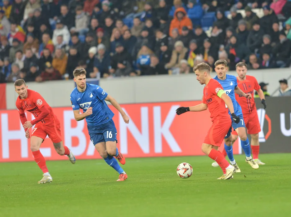 Darius Dumitru Olaru, Florin Lucian Tănase și Anton Stach, Tom Bischof în meciul de fotbal dintre Hoffenheim și FCSB, contând pentru UEFA Europa League, desfășurat pe Stadionul Rhein-Neckar-Arena din Sinsheim, joi 12 decembrie 2024. © FOTO: Alexandra Cristina GRIGORESCU/SPORT PICTURES