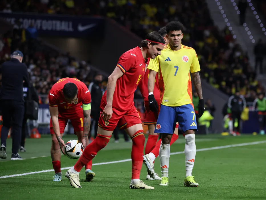 Nicolae Stanciu, Ianis Hagi si Luis Díaz in meciul amical de fotbal dintre Columbia si Romania, desfasurat pe Stadionul Wanda Metropolitano din Madrid, marti 26 martie 2024. © FOTO:SPORT PICTURES