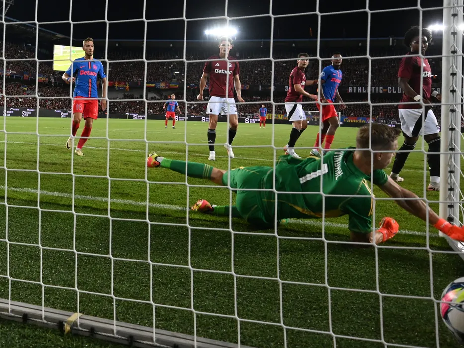 Mihai Daniel Lixandru, Peter Vindahl, Siyabonga Ngezana si Angelo Preciado la faza golului reusit de catre Joyskim Aurelien Dawa Tchakonte in meciul dintre Sparta Praga si FCSB, contand pentru Preliminariile Ligii Campionilor, desfasurat pe Stadionul Letna din Praga, marti 6 august 2024. © FOTO:Razvan Pasarica/SPORT PICTURES