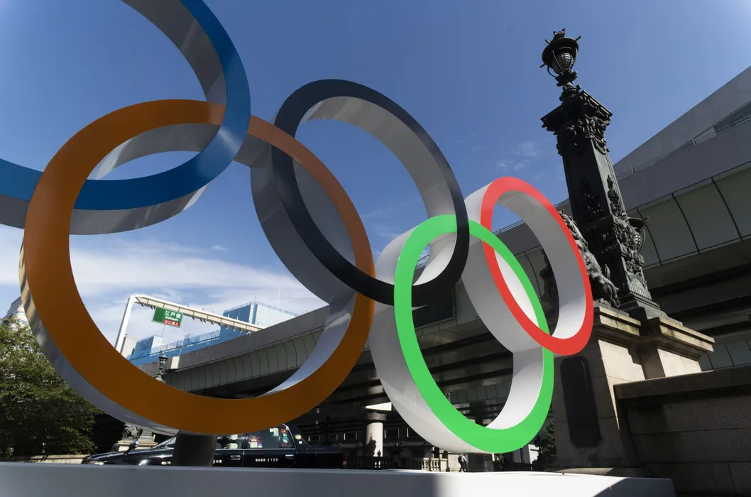 This photo shows the Olympic rings installed by the Nippon Bashi bridge in Tokyo on Thursday, July 15, 2021. (AP Photo/Hiro Komae)