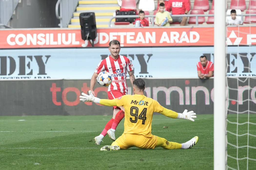 Marinos Tzioni si Eduard Adrian Pap in meciul de fotbal dintre UTA Arad si FK Csikszereda Miercurea Ciuc, contand pentru Superliga Superbet, desfasurat pe Arena Francisc Neuman din Arad, sambata 27 septembrie 2025. © FOTO:Alexandra Fechete/SPORT PICTURES