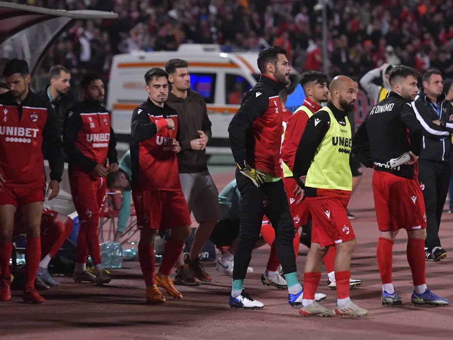 Fotbalistii dinamovisti Andrei Radu, Figueiredo Cristiano Pereira, Gabriel Rodrigues De Moura si Alexandru Ilie Rauta suparati dupa meciul de fotbal dintre Dinamo Bucuresti si Universitatea Cluj, Barajul pentru mentinerea in Liga 1 Casa Pariurilor, desfasurat pe Stadionul Dinamo din Bucuresti, duminica 29 mai 2022. © FOTO:Razvan Pasarica/SPORT PICTURES
