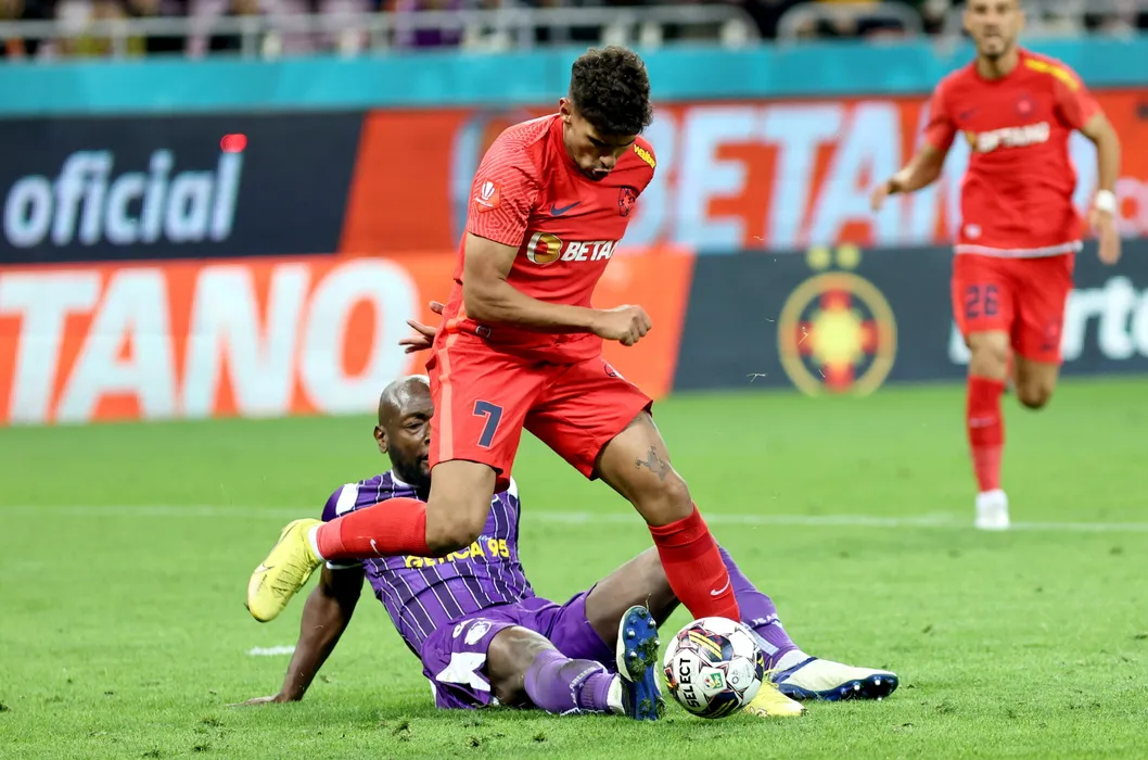 Florinel Coman (sus), de la FCSB, lupta pentru balon cu Mike Cestor (jos), de la FC Arges, in meciul de fotbal din etapa a XII-a a Superligii, disputat pe Arena Nationala din Bucuresti, duminica, 2 octombrie 2022. GEORGE FILIP / MEDIAFAX FOTO