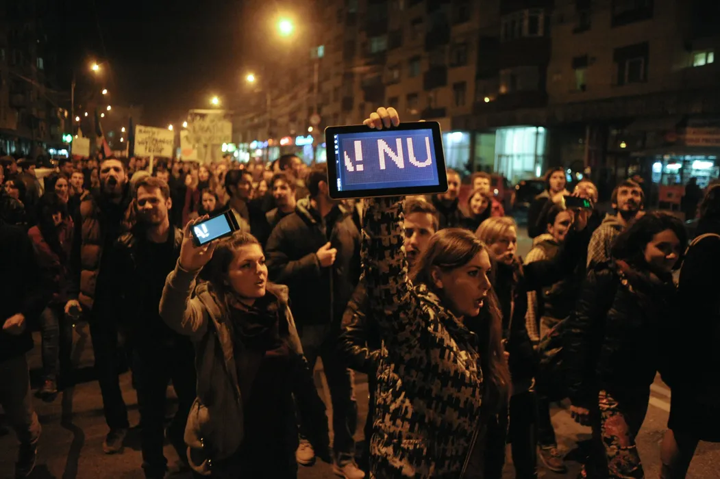 Persoane participa la un miting de solidaritate cu românii din diaspora care nu au putut vota în primul tur al alegerilor, acestea scandând ”Jos Ponta” si având pancarte pe care scrie ”Ponta nu uita ca Ardealul nu te vrea”, in Piata Unirii din Cluj-Napoca, vineri, 14 noiembrie 2014. Mitingul de la Cluj-Napoca, la care au participat peste 10.000 de persoane s-a încheiat fara incidente, dupa aproximativ patru ore, timp în care manifestantii au mers în mars prin oras si au scandat împotriva premierului Victor Ponta. RAUL STEF / MEDIAFAX FOTO