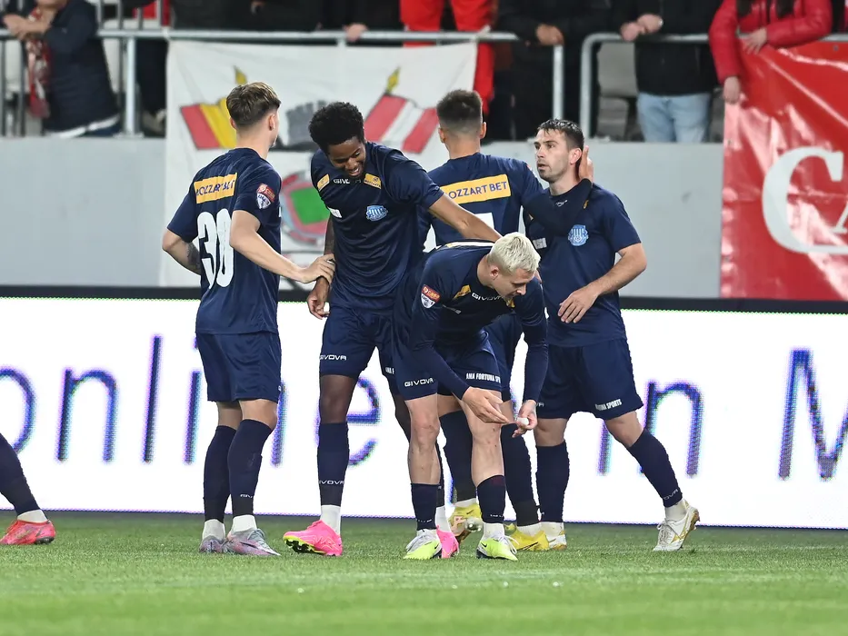 Alin Roman este felicitat de catre Shayon Harrison si Catalin Hlistei dupa un gol marcat in meciul de fotbal dintre Dinamo Bucuresti si Politehnica Iasi, contand pentru Play-off-ul Ligii a-2-a, desfasurat pe Stadionul National Arcul de Triumf din Bucuresti, marti 25 aprilie 2023. © FOTO:Razvan Pasarica/SPORT PICTURES