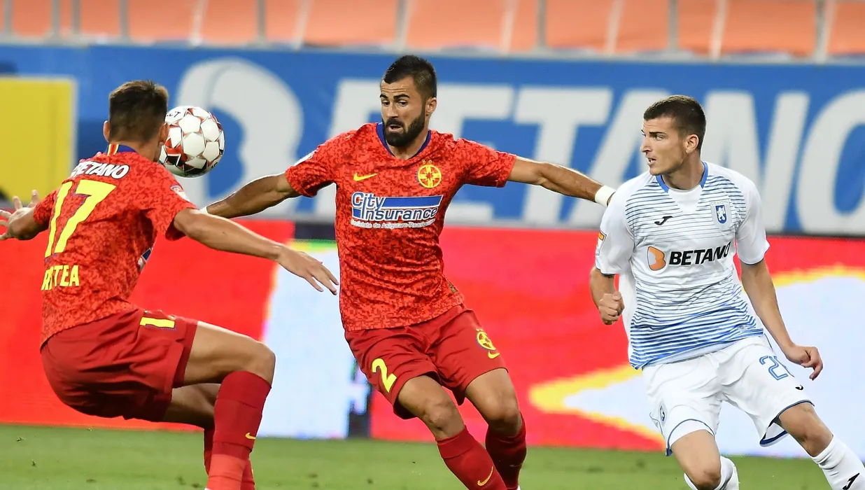Valentin Cretu si Mihai Valentin Mihaila in meciul de fotbal dintre Universitatea Craiova si FCSB, contand pentru play-off-ul Ligii 1 Casa Pariurilor, disputat fara spectatori pe Stadionul Ion Oblemenco din Craiova, duminica 12 iulie 2020. © FOTO:Razvan Pasarica/SPORT PICTURES