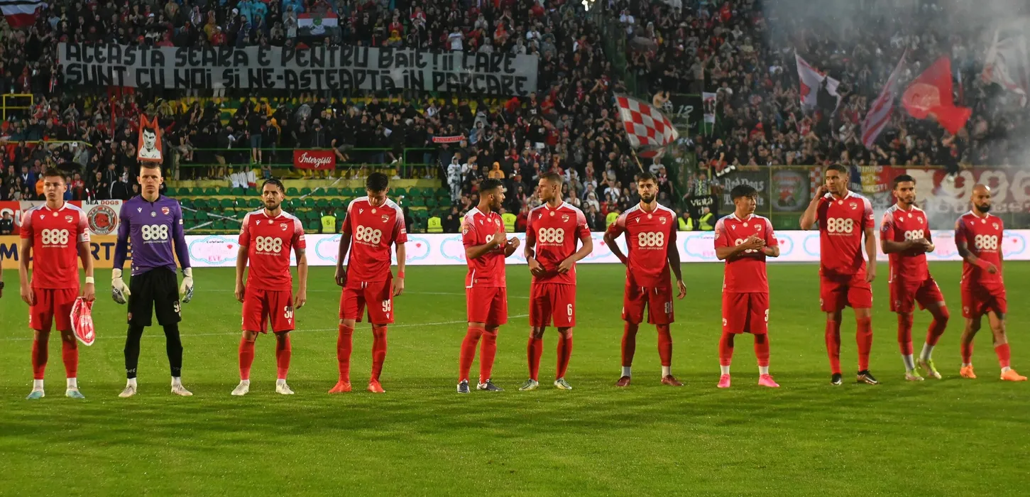 Fotbalistii dinamovisti la startul meciului de fotbal dintre FC Arges si Dinamo Bucuresti, contand pentru mansa retur a Barajului pentru mentinerea in Superliga Superbet, desfasurat pe Stadionul Orasenesc din Mioveni, sambata 3 iunie 2023. © FOTO:Razvan Pasarica/SPORT PICTURES