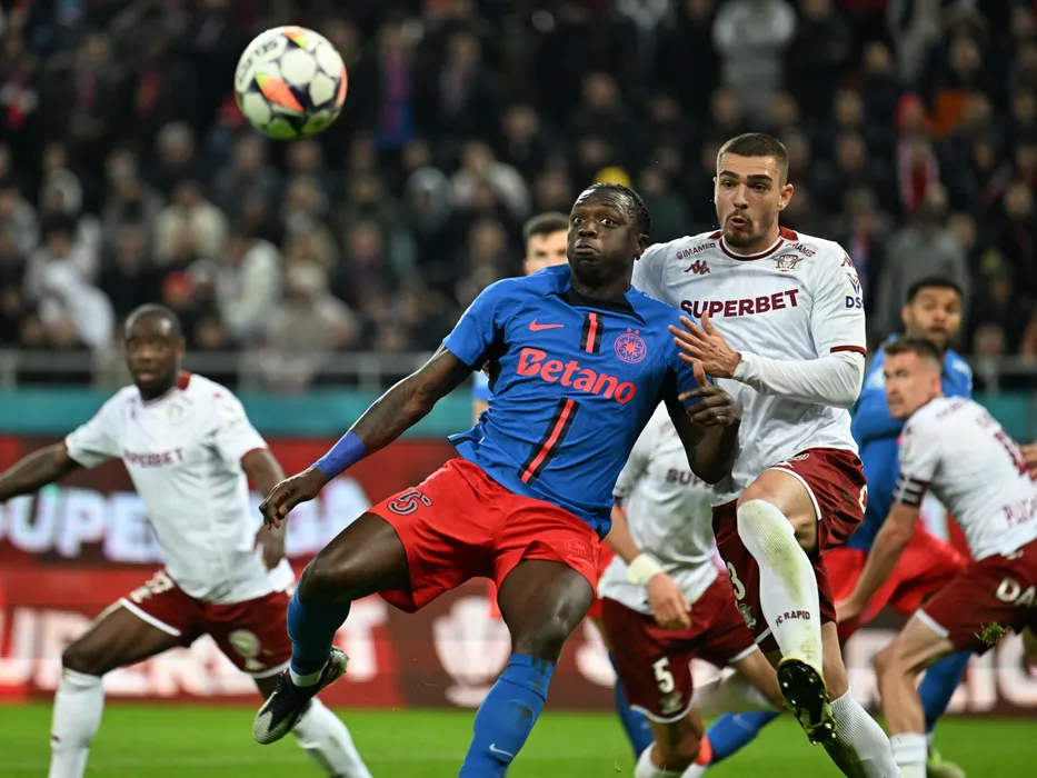 Joyskim Aurelien Dawa Tchakonte si Denis Ciobotariu in meciul de fotbal dintre FCSB si Rapid Bucuresti, contand pentru Play off-ul Superligii Superbet, desfasurat pe Arena Nationala din Bucuresti, duminica 16 martie 2025. © FOTO:Razvan Pasarica/SPORT PICTURES
