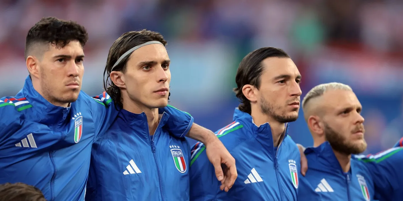 Leipzig, Germany, 24th June 2024. Alessandro Bastoni, Riccardo Calafiori, Matteo Darmian and Federico Dimarco of Italy line up for the national anthem prior to kick off in the UEFA European Championships match at Leipzig Stadium, Leipzig. Picture credit should read: / Sportimage EDITORIAL USE ONLY. No use with unauthorised audio, video, data, fixture lists, club/league logos or live services. Online in-match use limited to 120 images, no video emulation. No use in betting, games or single club/league/player publications. SPI-3190-0097,Image: 885545662, License: Rights-managed, Restrictions: Credit images as "Profimedia/ IMAGO", Model Release: no