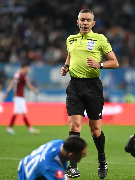 Arbitrul central Radu Petrescu reactioneaza in meciul de fotbal dintre Universitatea Craiova si Rapid Bucuresti, contand pentru Play-off-ul Superligii Superbet, desfasurat pe Stadionul Ion Oblemenco din Craiova, duminica 16 aprilie 2023. © FOTO:Razvan Pasarica/SPORT PICTURES