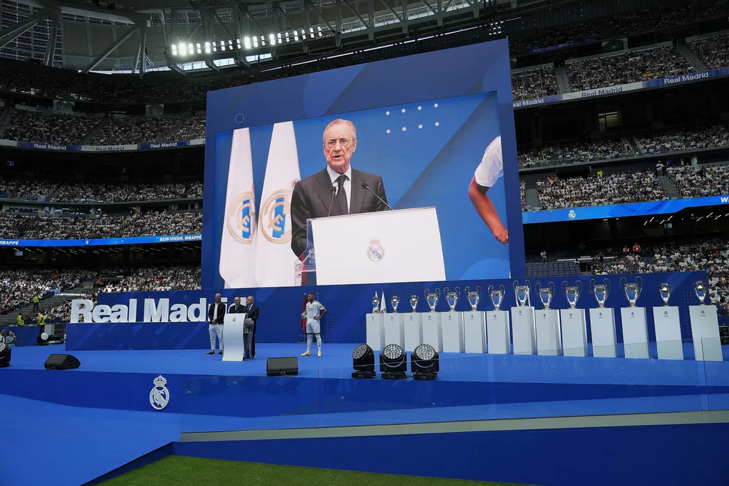 MADRID, SPAIN - JULY 16: Real Madrid president Florentino Perez (screen) speaks during the Kylian Mbappe presentation as a new Real Madrid player at Estadio Santiago Bernabeu on July 16, 2024 in Madrid, Spain. Jose Hernandez / Anadolu/ABACAPRESS.COM
