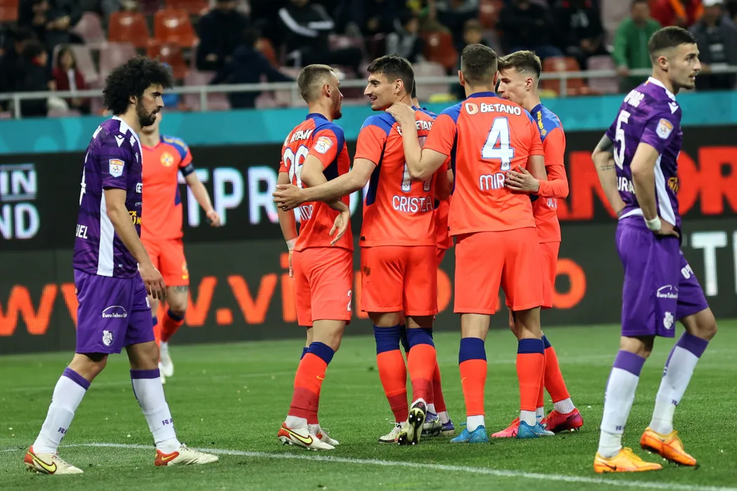 Iulian Cristea (C), de la FCSB, este felicitate de coechipieri dupa ce a inscris un gol in timpul meciului de fotbal contra echipei FC Arges din etapa a 7- a a play-off-ului Ligii 1, disputat pe Arena Nationala din Bucuresti, luni, 2 mai 2022. GEORGE FILIP / MEDIAFAX FOTO