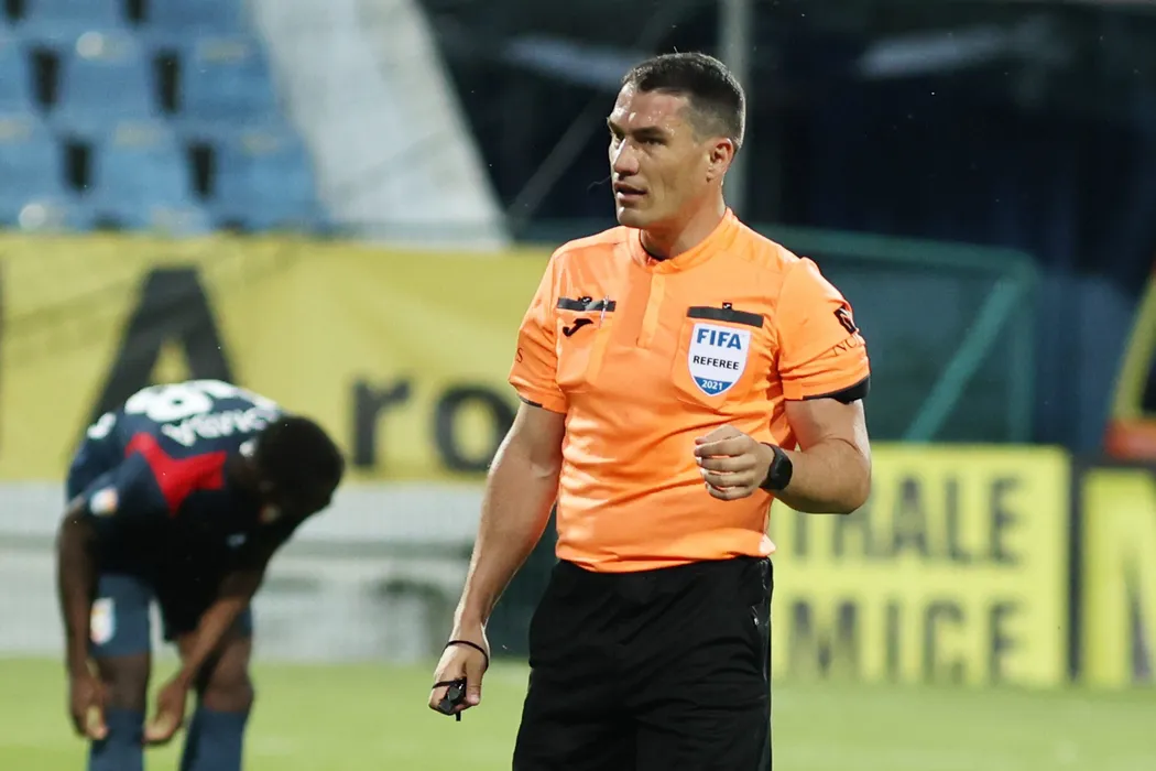 Arbitrul central Istvan Kovacs in meciul de fotbal dintre Chindia Targoviste si Viitorul Constanta, contand pentru Barajul semifinala Confrence League, desfasurat pe Stadionul Gloria din Buzau, joi 27 mai 2021. © FOTO:Gheorghe Fluster/SPORT PICTURES