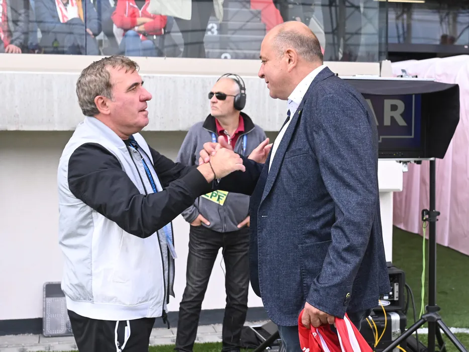Gheorghe Hagi discuta cu Laszlo Dioszegi la meciul de fotbal dintre Sepsi OSK Sfantu Gheorghe si Farul Constanta, contand pentru Superliga Superbet, desfasurat pe Sepsi Arena din Sfantu Gheorghe, duminica 9 octombrie 2022. © FOTO:Razvan Pasarica/SPORT PICTURES