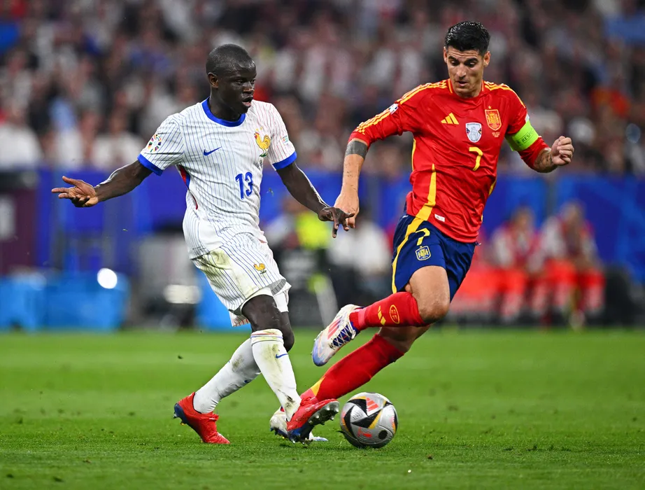 09 July 2024, Bavaria, Munich: France's N'Golo Kante (L) and Spain's Alvaro Morata (R) battle for the ball during the UEFA Euro 2024 Semi-final soccer match between Spain and France at Munich Football Arena. Photo: Tom Weller/dpa