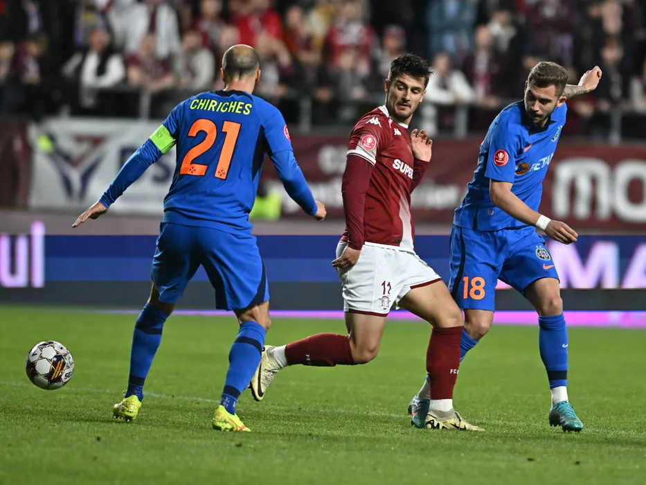 Borisav Burmaz, în duel cu Vlad Chiricheș și Andrei Pandele. Rapid - FCSB 2-0, 19.05.2024. Sursa foto: Sport Pictures