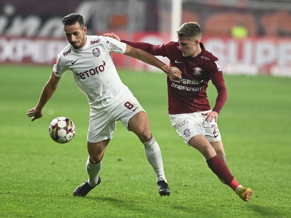 Roger Junio Rodrigues Figueira si Xin Ghislaine R. Emmers in meciul de fotbal dintre Rapid Bucuresti si CFR Cluj, contand pentru Superliga Superbet, desfasurat pe Stadionul Rapid Giulesti din Bucuresti, duminica 30 octombrie 2022. © FOTO:Razvan Pasarica/SPORT PICTURES