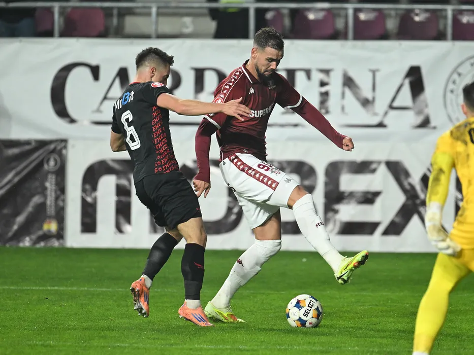 Lorand Paszka si Elvir Koljic in meciul de fotbal dintre Rapid Bucuresti si FK Csikszereda Miercurea Ciuc, din cadrul Superligii Superbet, desfasurat pe Superbet Arena-Giulesti din Bucuresti, vineri 28 noiembrie 2025. © FOTO:Razvan Pasarica/SPORT PICTURES