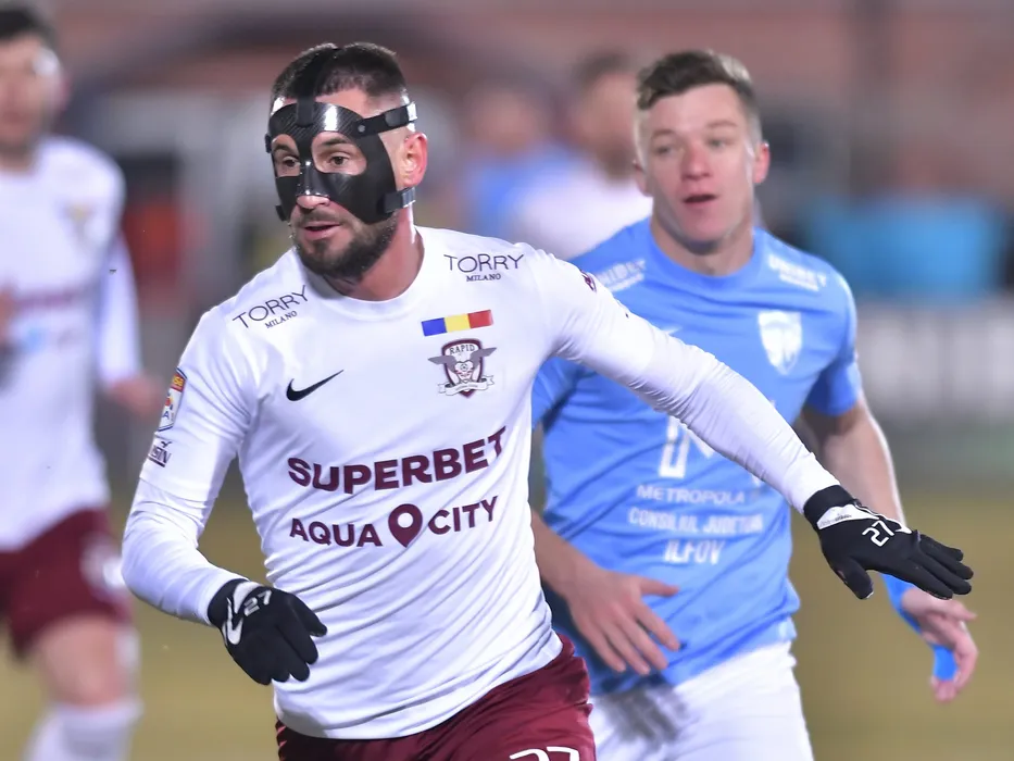 Dragos Grigore cu masca de protectie pe fata in meciul de fotbal dintre FC Voluntari si Rapid Bucuresti, contand pentru Liga 1 Casa Pariurilor, desfasurat pe Stadionul Anghel Iordanescu din Voluntari, marti 8 februarie 2022. © FOTO:Razvan Pasarica/SPORT PICTURES