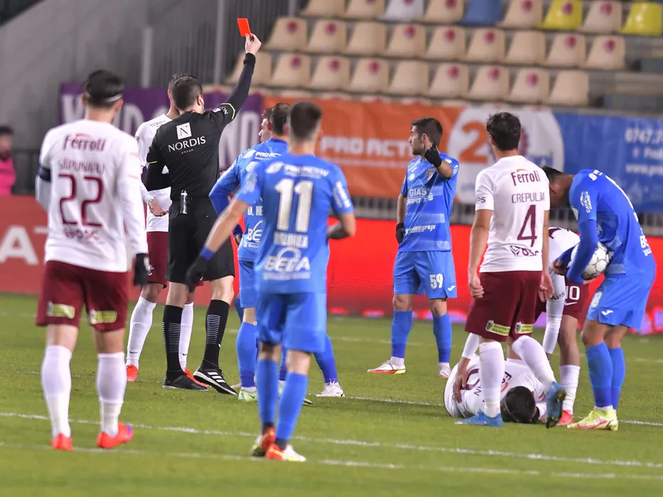 Arbitrul central Andrei Florin Chivulete acorda un cartonas rosu sub privirile lui Doru Popadiuc in meciul de fotbal dintre Chindia Targoviste si Rapid Bucuresti, contand pentru Liga 1 Casa Pariurilor, desfasurat pe Stadionul Ilie Oana din Ploiesti, vineri 19 noiembrie 2021. © FOTO:Razvan Pasarica/SPORT PICTURES