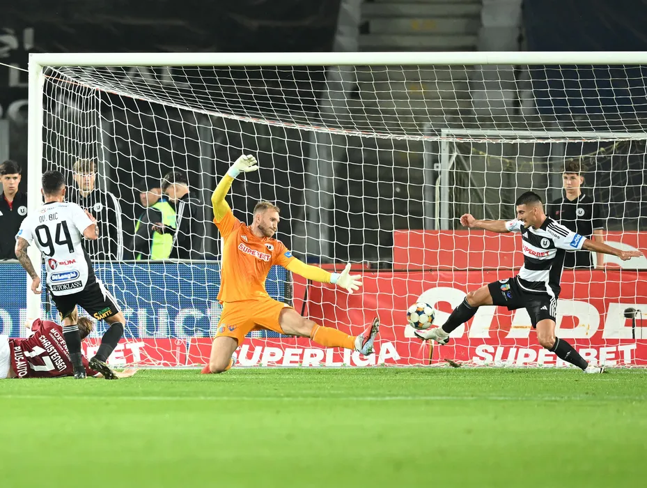 Edvinas Gertmonas si Lucian Iulian Cristea in meciul de fotbal dintre FC Universitatea Cluj si FC Rapid Bucuresti, contand pentru Superliga Superbet, desfasurat pe Cluj Arena din Cluj-Napoca, vineri 12 septembrie 2025. © FOTO:Flaviu Buboi/SPORT PICTURES