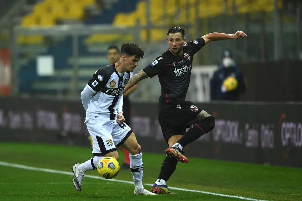 Mitchell Dijks (Bologna)Dennis Man (Parma) during the Italian "Serie A match between Parma 0-3 Bologna at Ennio Tardini Stadium on February 07, 2021 in Parma, Italy. (Photo by Maurizio Borsari/AFLO),Image: 589486467, License: Rights-managed, Restrictions: No third party sales, Model Release: no