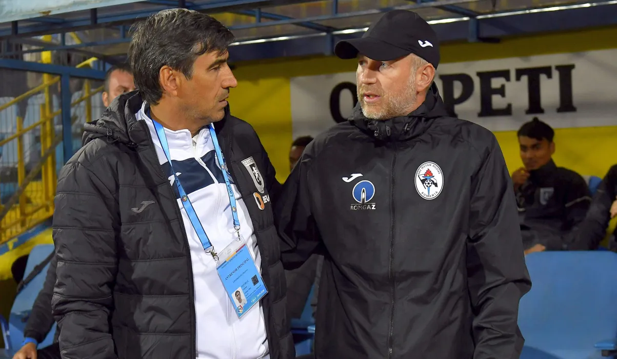 Victor Piturca se saluta cu Edward Iordanescu la meciul de fotbal dintre Gaz Metan Medias si Universitatea Craiova, contand pentru Liga 1 Casa Pariurilor, desfasurat pe Stadionul Municipal din Medias, vineri 20 septembrie 2019. © FOTO:Razvan Pasarica/SPORT PICTURES
