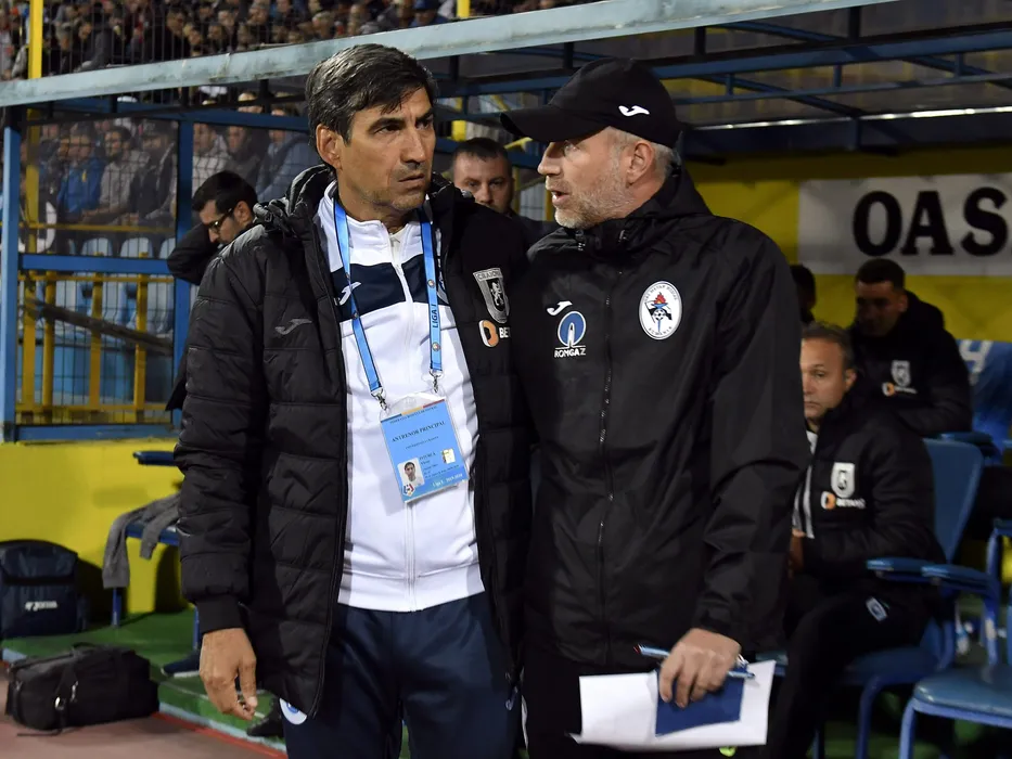 Victor Piturca se saluta cu Edward Iordanescu la meciul de fotbal dintre Gaz Metan Medias si Universitatea Craiova, contand pentru Liga 1 Casa Pariurilor, desfasurat pe Stadionul Municipal din Medias, vineri 20 septembrie 2019. © FOTO:Razvan Pasarica/SPORT PICTURES