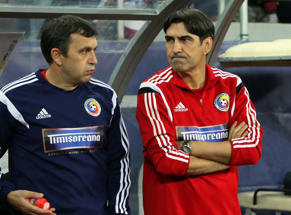 Eugen Neagoe (S), secundul antrenorului Victor Piturca (D) de la echipa nationala a Romaniei, reactioneaza in meciul cu Ungaria, din grupa F a preliminariilor Campionatului European din 2016, pe Arena Nationala, in Bucuresti, sambata, 11 octombrie 2014. GEORGE FILIP / MEDIAFAX FOTO