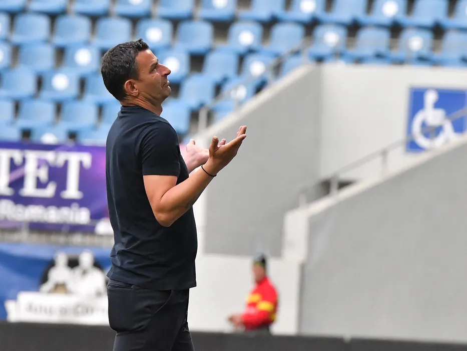 Eugen Trică discută cu galeria după meciul de fotbal dintre FCU 1948 Craiova și Dinamo București, contând pentru Superliga Superbet Play-Out, desfășurat pe Stadionul Ion Oblemenco din Craiova, sâmbătă 20 aprilie 2024. © FOTO: Remus BADEA/SPORT PICTURES