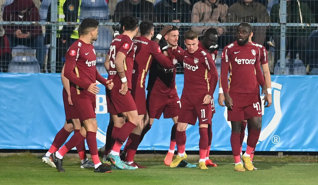 Bucurie a fotbalistilor clujeni dupa un gol marcat cu Ermal Krasniqi, Claudiu Adrian Mihai Petrila si Christopher Braun in meciul de fotbal dintre Farul Constanta si CFR Cluj, contand pentru Superliga Superbet, desfasurat pe Stadionul central al Academiei Gheorghe Hagi din Ovidiu, luni 23 ianuarie 2023. © FOTO:Razvan Pasarica/SPORT PICTURES