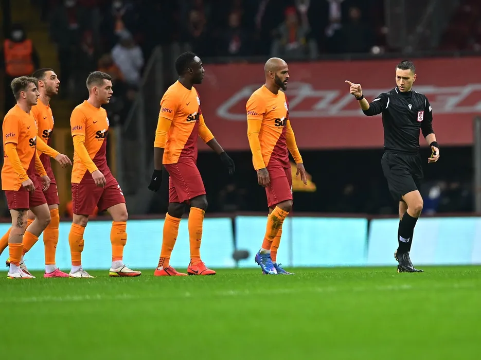 Referee Zorbay Kucuk and Marcao , Mbaye Diagne , Alexandru Cicaldau of Galatasaray during the Turkish Super League football match between Galatasaray and Basaksehir at NEF Stadium in Istanbul , Turkey on December 18 , 2021.,Image: 648583104, License: Rights-managed, Restrictions: Not available for publication in Turkey., Model Release: no, Credit line: Profimedia