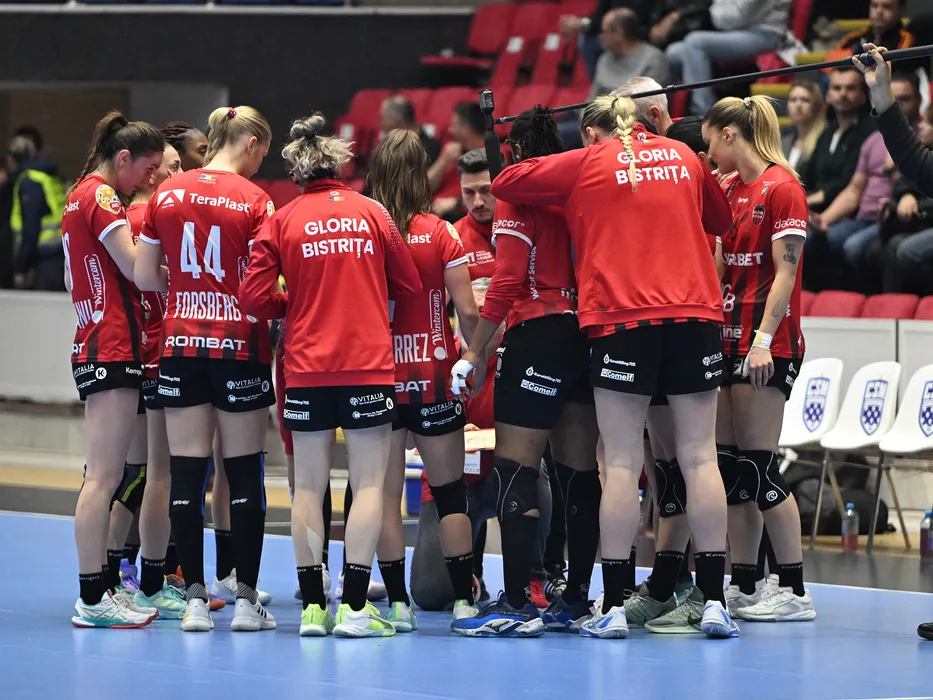 Handbalistele bistritene la un timeout luat in meciul de handbal feminin dintre CSM Bucuresti si Gloria Bistrita, din cadrul Ligii Florilor, desfasurat in Sala Polivalenta-Ioan Kunst Ghermanescu din Bucuresti, luni 16 martie 2026 © FOTO:Razvan Pasarica/SPORT PICTURES