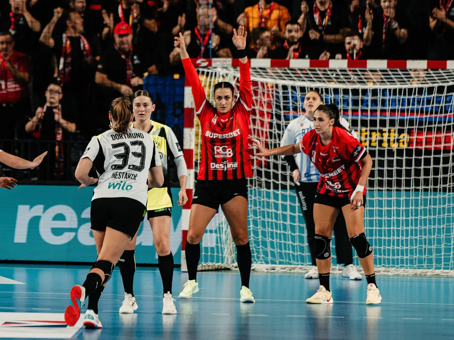 Bianca Maria Bazaliu si Lorena-Gabriela Ostase in meciul de handbal feminin dintre Gloria Bistrita și BV Borussia Dortmund, contand pentru Liga Campionilor, desfasurat in Sala Polivalenta Teraplast Arena din Bistrita, duminica 9 noiembrie 2025. © FOTO:Bianca Salagean/SPORT PICTURES