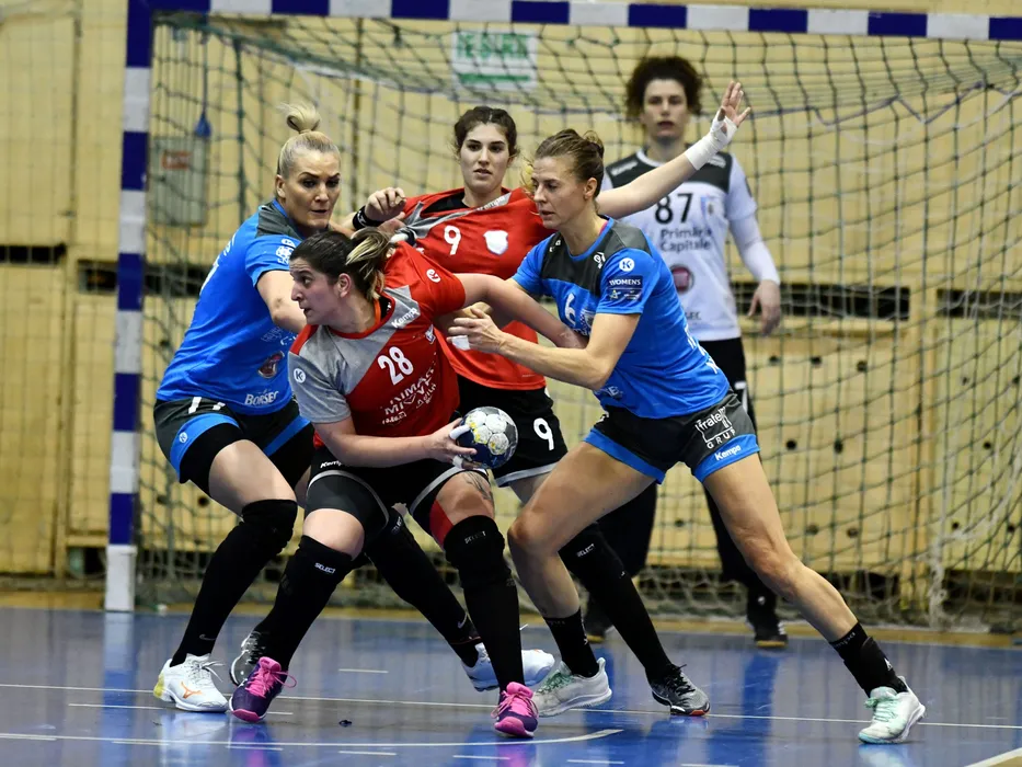 Crina Pintea si Linea Torstensson in meciul de handbal feminin dintre CS Dacia Mioveni si CSM Bucuresti, contand pentru Cupa Romaniei Fan Courier, disputat in Sala Sporturilor din Pitesti, luni 17 februarie 2019. © FOTO:Razvan Pasarica/SPORT PICTURES