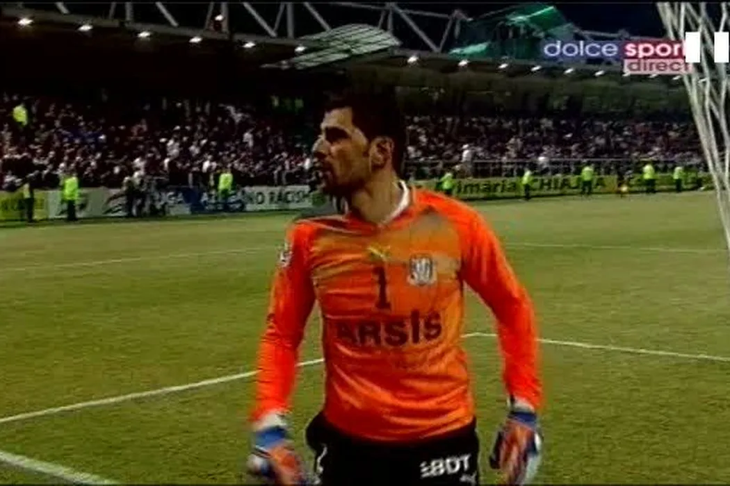 VIDEO** RĂ‚ZBOI între galeria Rapidului și Coman! Portarul a aruncat cu o sticlă cu apă înspre ei, fanii au vrut să intre în teren