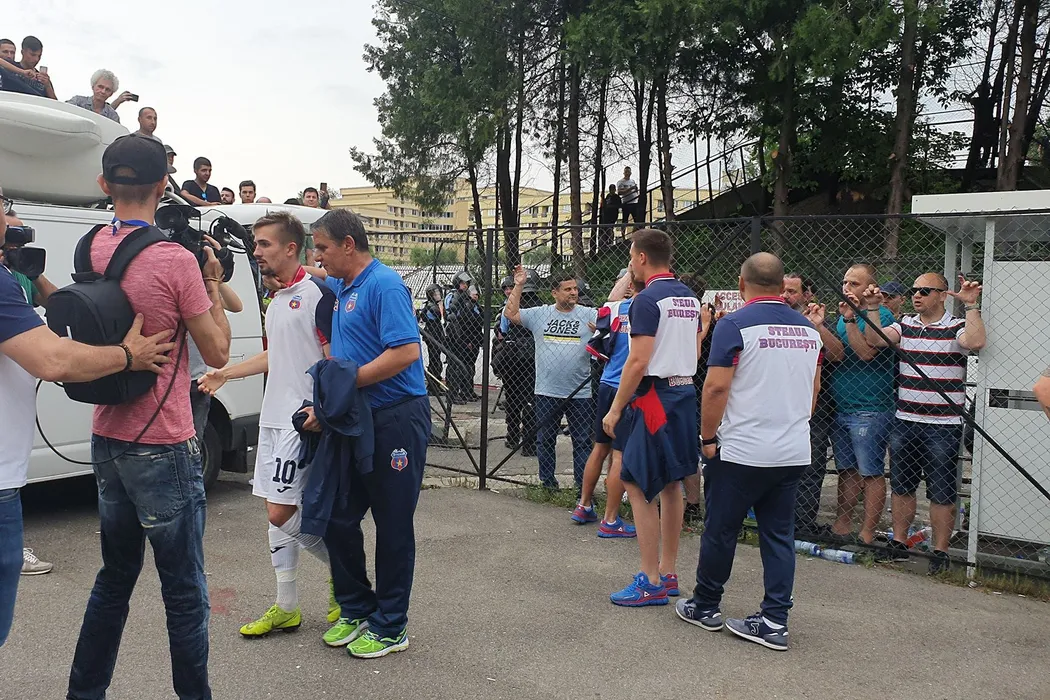VIDEO și FOTO | Imaginile durerii la Steaua, după ratarea promovării! Jucători în genunchi, fotbaliști dezbrăcați în fața peluzei și momente tensionate în afara stadionului