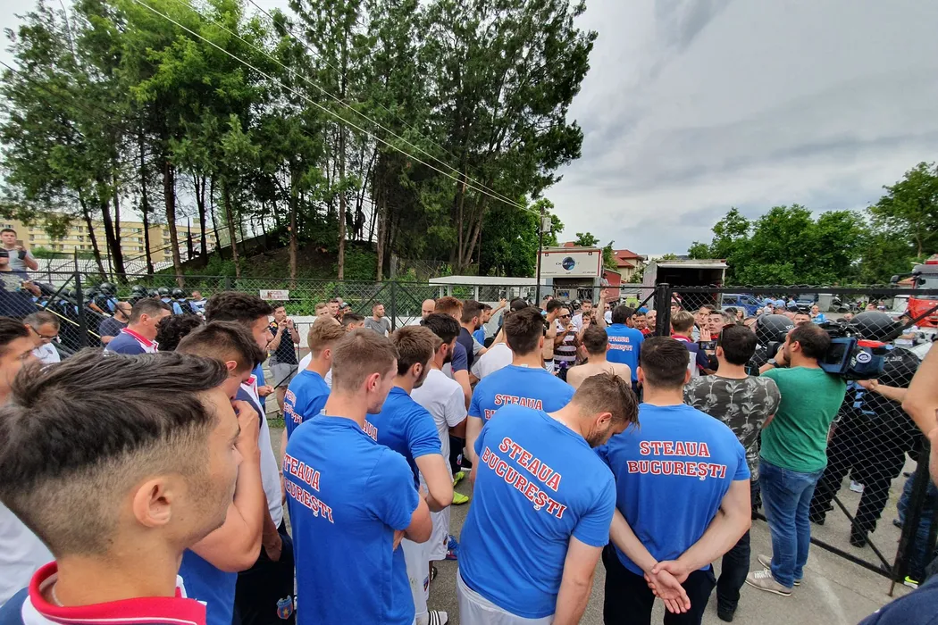 VIDEO și FOTO | Imaginile durerii la Steaua, după ratarea promovării! Jucători în genunchi, fotbaliști dezbrăcați în fața peluzei și momente tensionate în afara stadionului