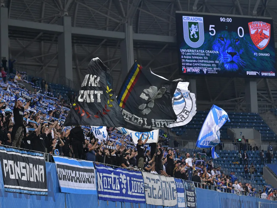 Tabela de marcaj alaturi de suporterii craioveni cu steaguri si fulare in peluza dupa meciul de fotbal dintre Universitatea Craiova si Dinamo Bucuresti, contand pentru Liga 1 Casa Pariurilor, desfasurat pe Stadionul Ion Oblemenco din Craiova, luni 27 septembrie 2021. © FOTO:Razvan Pasarica/SPORT PICTURES