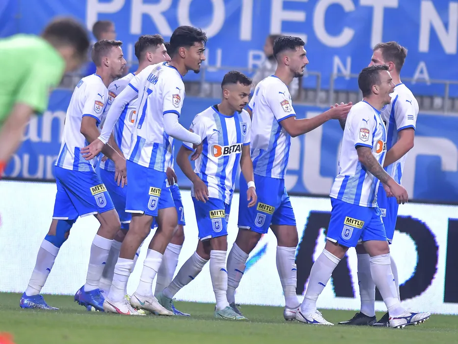 Bucurie a fotbalistilor craioveni dupa un gol marcat cu Nicusor Silviu Bancu, Alexandru George Cimpanu, Lyes Hafid Houri, Andrei Virgil Ivan si Mihai Alexandru Balasa in meciul de fotbal dintre Universitatea Craiova si Academica Clinceni, contand pentru Liga 1 Casa Pariurilor, desfasurat pe Stadionul Ion Oblemenco din Craiova, luni 18 octombrie 2021. © FOTO:Razvan Pasarica/SPORT PICTURES