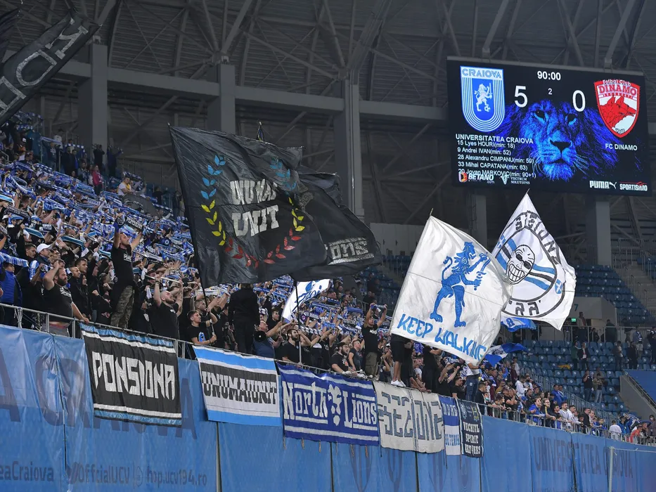 Tabela de marcaj alaturi de suporterii craioveni cu steaguri si fulare in peluza dupa meciul de fotbal dintre Universitatea Craiova si Dinamo Bucuresti, contand pentru Liga 1 Casa Pariurilor, desfasurat pe Stadionul Ion Oblemenco din Craiova, luni 27 septembrie 2021. © FOTO:Razvan Pasarica/SPORT PICTURES