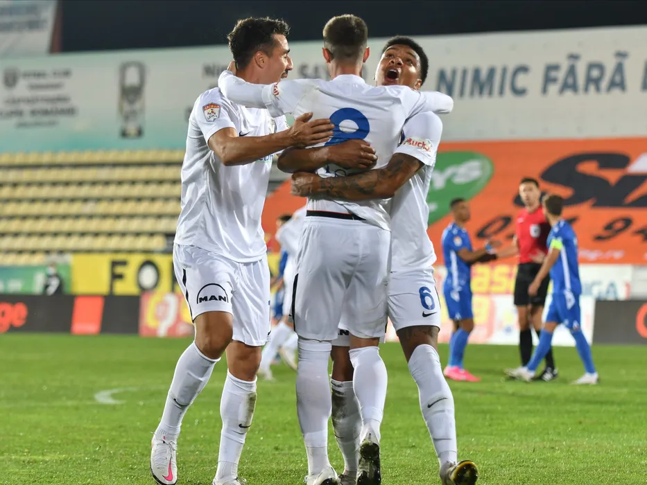 Carlo Roberto Casap se bucura dupa un gol marcat alaturi de Virgil Andrei Ciobanu si Bradley de Nooijer in meciul de fotbal dintre FC Voluntari si FC Viitorul Constanta, contand pentru Liga 1 Casa Pariurilor, desfasurat fara spectatori pe Stadionul Anghel Iordanescu din Voluntari, luni 19 octombrie 2020. © FOTO:George Ilinca/SPORT PICTURES