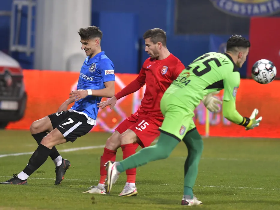 Virgil Andrei Ciobanu, Cornel Dinu si Marian Mihai Aioani in meciul de fotbal dintre FC Viitorul Constanta si Chindia Targoviste, din cadrul Ligii 1 Casa Pariurilor, desfasurat fara spectatori pe Stadionul Central al Academiei Gheorghe Hagi din Ovidiu, miercuri 17 martie 2021. © FOTO:Razvan Pasarica/SPORT PICTURES