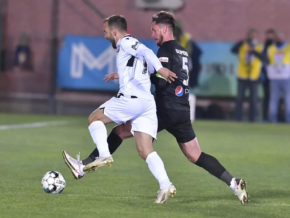 Viktor Angelov si Sebastian Mladen in meciul de fotbal dintre FC Voluntari si FC Viitorul Constanta, contand pentru Play-off-ul Ligii 1 Casa Pariurilor, desfasurat fara spectatori pe Stadionul Anghel Iordanescu din Voluntari, luni 26 aprilie 2021. © FOTO:Razvan Pasarica/SPORT PICTURES