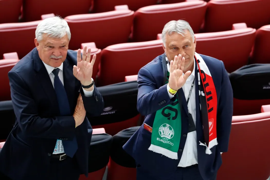 Hungary's Prime Minister Viktor Orban, right, and the Head of the Hungarian soccer federation Sandor Csanyi wave prior to the start of the Euro 2020 soccer championship group F match between Hungary and Portugal at the Ferenc Puskas stadium in Budapest, Hungary, Tuesday, June 15, 2021.,Image: 615775861, License: Rights-managed, Restrictions: This content is intended for editorial use only. For other uses, additional clearances may be required.