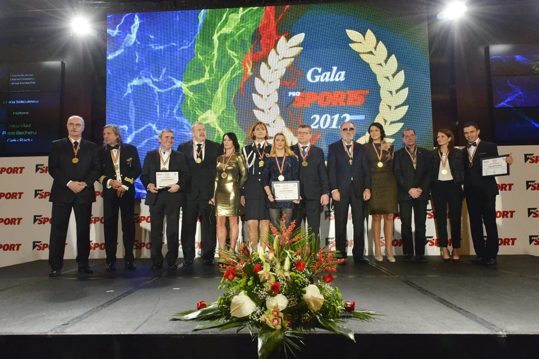 De la stanga la dreapta: Octavian Belu, Ilie Nastase, Gheorghe Hagi, Helmuth Duckadam, Nadia Comaneci, Elisabeta Lipa, Alina Dumitru, Nicu Vlad, Ion Tiriac, Georgeta Andrunache, Ivan Patzaichin, Laura Badea si Carol Eduard Novac participa la Gala Prosport 2012, desfasurata in Bucuresti, joi, 29 noiembrie 2012. BOGDAN IORDACHE / MEDIAFAX FOTO