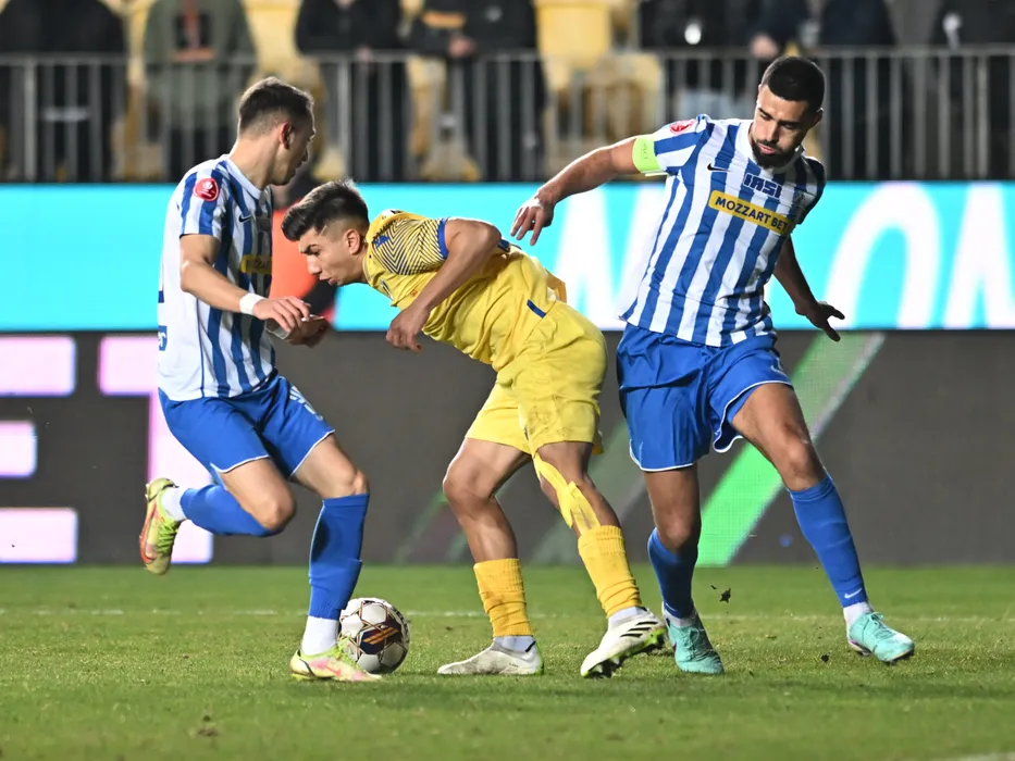 Alexandru Marian Musi si Rachid Ahmd Bouhenna în meciul de fotbal dintre Petrolul Ploiesti si Politehnica Iasi, contând pentru Superliga Superbet, desfășurat pe Stadionul Ilie Oana din Ploiesti, vineri 16 februarie 2024. © FOTO: Răzvan PĂSĂRICĂ/SPORT PICTURES