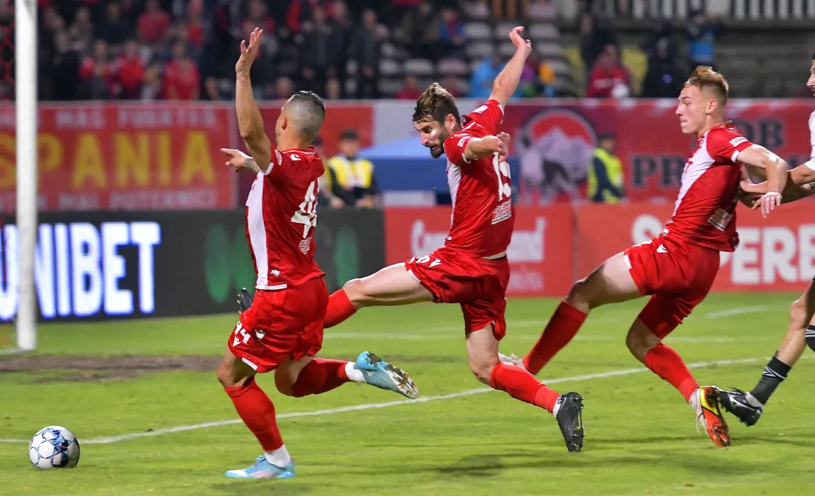 Fotbalistii dinamovisti Mirko Ivanovski, Bruno Patrick Aloe Baptiste si Balthazar Jean Phillipe Marie Pierret disperati dupa un balon in meciul de fotbal dintre Dinamo Bucuresti si Universitatea Cluj, Barajul pentru mentinerea in Liga 1 Casa Pariurilor, desfasurat pe Stadionul Dinamo din Bucuresti, duminica 29 mai 2022. © FOTO:Razvan Pasarica/SPORT PICTURES