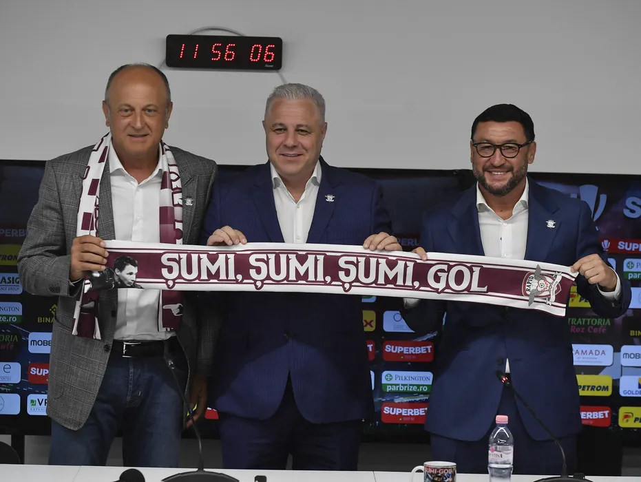 Dan Șucu, Marius Șumudică și Viorel Moldovan participă pozează împreună la conferința de presă desfășurată la Clubul Rapid din București, miercuri 21 august 2024. © FOTO: Sport Pictures